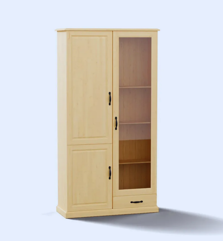 Имеет одну остекленную дверь, одну глухую дверь в нижней части один выдвижной ящик.