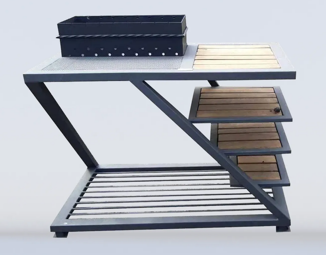 Мангал состоит из основания (каркаса) и жаровни, покрытой термостойкой краской. В боковых стенках жаровни специальные пазы для шампуров.Имеется дополнительное место для разделки с деревянным настилом.