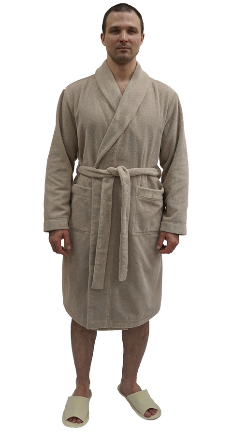 Халат мужской махровый прямого силуэта, на запах, по талии завязывается на пояс, с боковыми накладными карманами. Воротник-апаж.