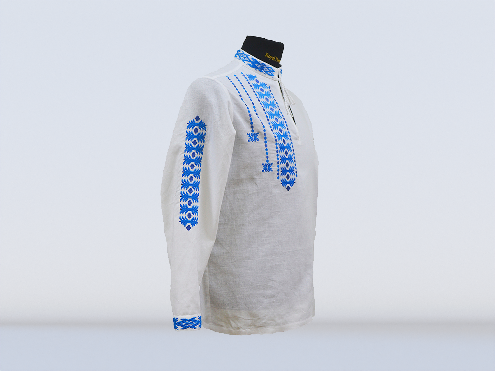 Сорочка верхняя мужская прямого силуэта, с длинными рукавами, воротник-стойка с застёжкой-завязкой на тесьму. На правом рукаве, по переду с правой стороны расположена вышивка "Васильки №1". На манжетах и воротнике - орнамент сине-василькового цвета.